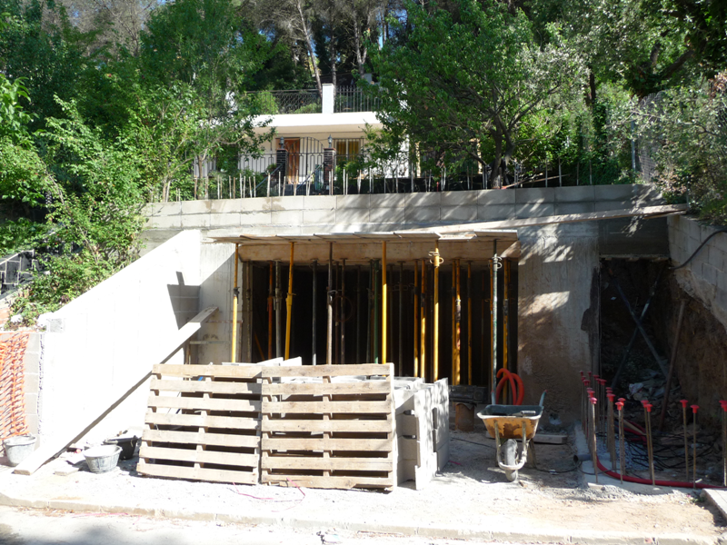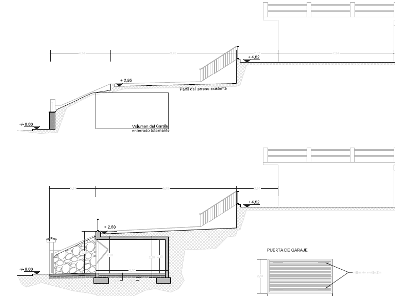 Projecte per a la realització d'un garatge soterrat, amb coberta ajardinada. Estructura realitzada amb murs de formigó i llosa. Inclou la integració i modificació de la tanca exterior.