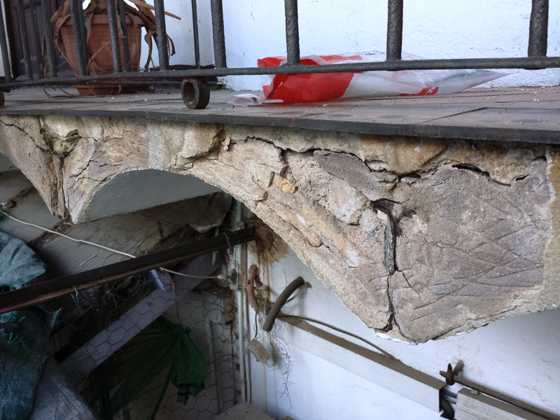 Rehabilitació parcial dels balcons de la façana posterior. Hi havia una pèrdua de secció als caps dels perfils metàl·lics. La solució per a reparar aquests elements va ser l'enderroc d'una part dels forjats i la reconstrucció amb les mateixes formes.